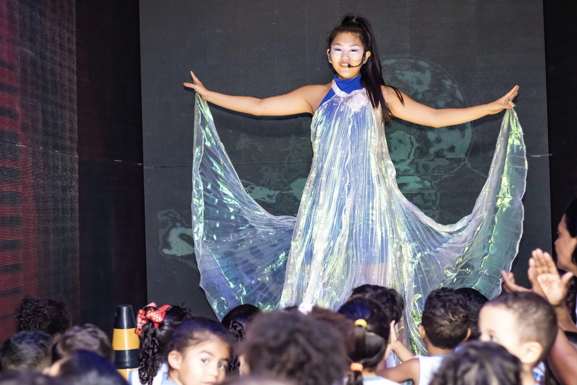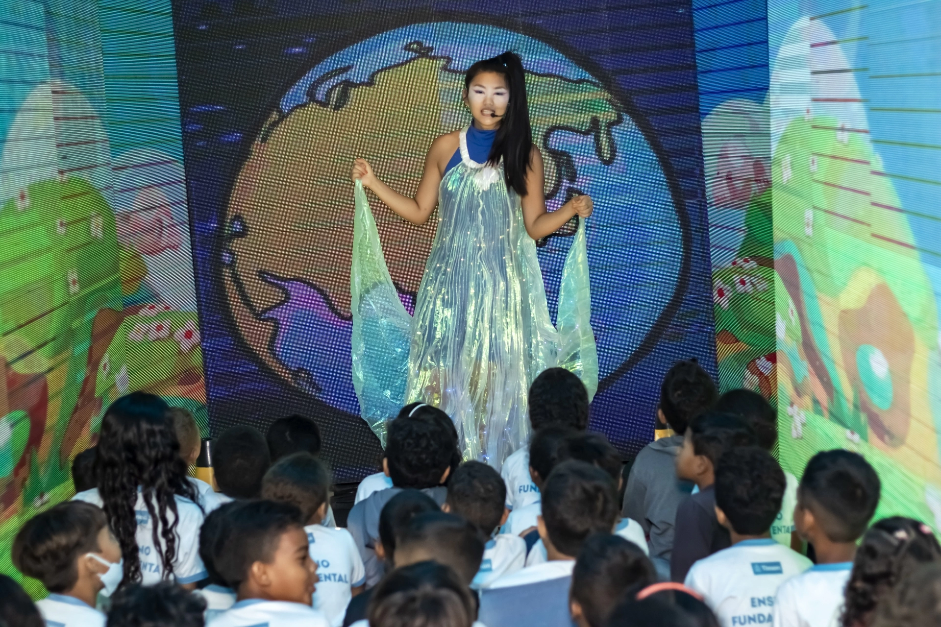 O cenário possui uma visão de 180 graus em um espaço de 12x3 metros e é totalmente digital, oferecendo ao espectador a sensação de estar dentro da história. Essa experiência imersiva estimula os sentidos e aproxima o público de atividades do mundo real, permitindo que todos estejam plenamente envolvidos no ambiente virtual criado.