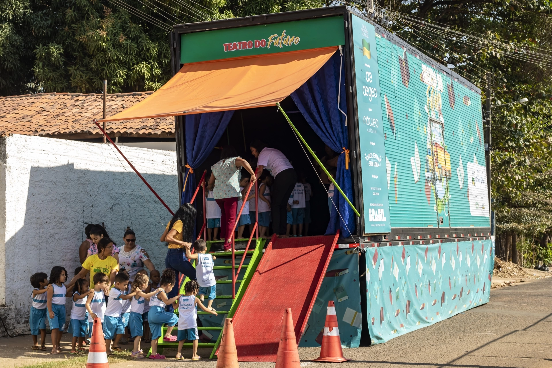 O projeto "Teatro do Futuro - Água" utiliza a estrutura de uma carreta para apresentações de contação de histórias com o tema saneamento básico. A peça explica como a água é tratada e chega até as pessoas, além de mostrar o que aconteceria se não fosse tratada e como podemos reutilizá-la no dia a dia.